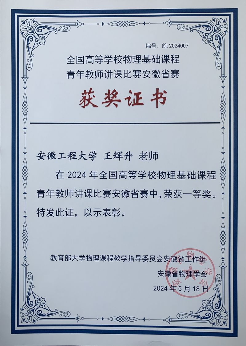 近期,全国高等学校物理基础课程青年教师讲课比赛安徽省初赛,在安庆师范大学举办,经过激烈角逐,数理与金融学院教师王辉升以饱满的热情和扎实的专业素养,展示了出色的教学风采,荣获安徽省赛区一等奖。