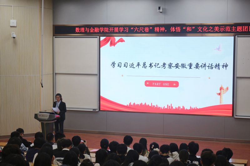 为深入学习贯彻党的二十届三中全会精神和习近平总书记考察安徽重要讲话精神,弘扬中华优秀传统美德,营造和谐相处的良好氛围,11月15日,数理与金融学院在2教报告厅开展学习“六尺巷”精神,体悟“和”文化之美示范主题团日活动。校团委书记李恒奎、学院党委副书记何志恒、学院辅导员及全体宿舍寝室长参加。