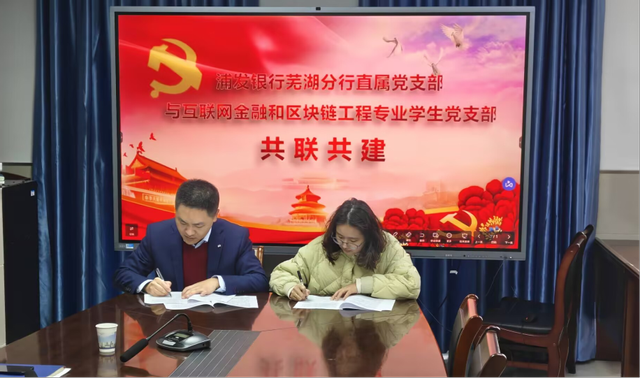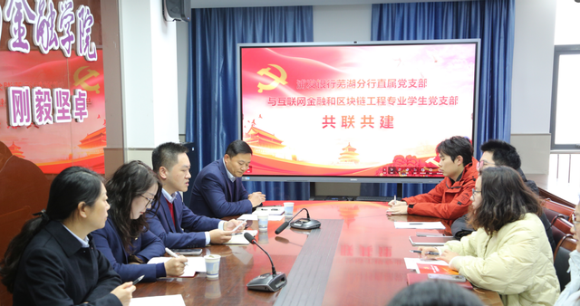 浦发银行芜湖分行直属党支部党员结合行业前沿趋势与银行实务经验,为学生党员开展职业规划与就业指导,引导学生进一步明晰发展方向,提升个人核心竞争力。双方围绕“党建引领、资源共享、协同育人”主题展开深入交流,并现场签署了共联共建合作协议。