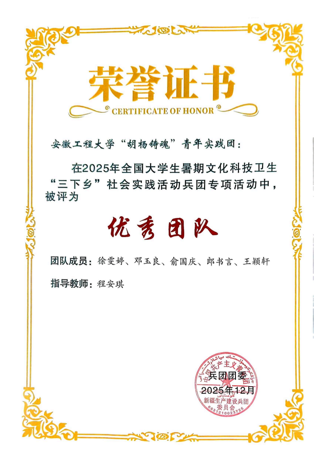 近日,我校数理与金融学院收到2025年全国大学生暑期文化科技卫生“三下乡”社会实践“卫国戍边兵团行”兵团专项活动荣誉证书。由程安琪老师指导,徐雯婷、邓玉良、俞国庆、郎书言、王颖轩组成的“胡杨铸魂”青年实践团获“优秀团队”称号。