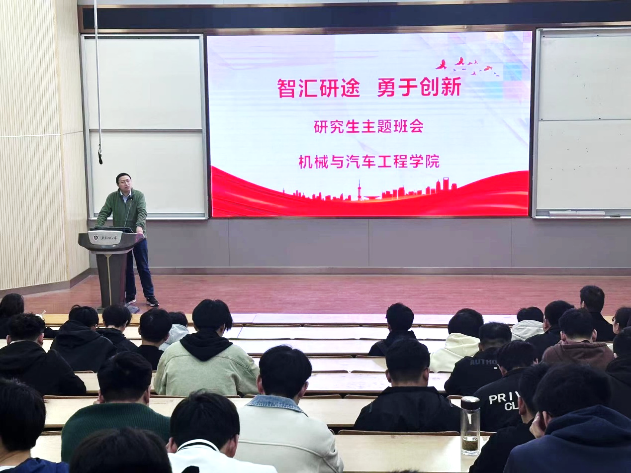 为更好落实学校和学院关于研究生培养教育的要求,提升研究生学习钻研和科技创新的积极性,加强对研究生的思想教育和素质能力培养,4月11日,机械与汽车工程学院召开“智汇研途,勇于创新”研究生主题班会,副院长潘家保和2022、2023级研究生参加。会议由研究生辅导员程雷老师主持。