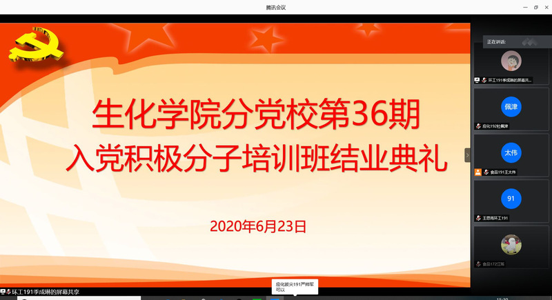 6月23日,生物与化学工程学院分党校第三十六期入党积极分子培训班结业典礼在线上举行。院党委副书记王辉、院组织员胡云、培训班全体学员参加结业典礼。典礼由培训班班主任程秀仙主持。