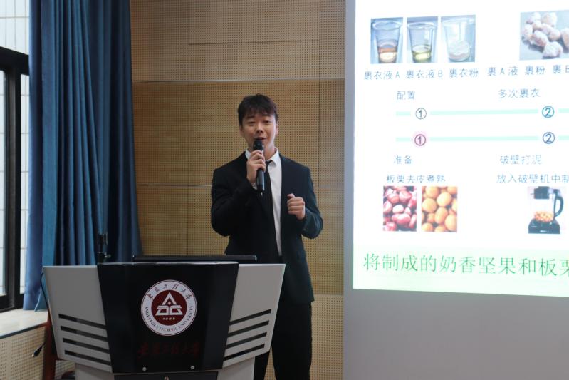 大赛分为初赛评审和决赛汇报两个环节。在初赛中,评委老师对各队伍提交上来的计划书进行了严格的评分,评分标准与大赛组委会评审标准一致。最终有10支队伍进入了复赛,筛选出了23支队伍推荐到中国食品科学技术学会第三届“三只松鼠杯休闲食品创新大赛。作为定向高校,我校圆满完成组委会规定的各项要求在复赛现场,另具特色的安排了五分钟产品PPT演讲汇报,各队伍的汇报紧扣本届大赛的主题,从市场分析、营养价值、工艺流程、产品创新、包装设计等几个主要方面详细介绍了队伍产品。在中场环节以及各队伍汇报结束时,评委对各队伍拥有的优点和存在的问题做出了点评。