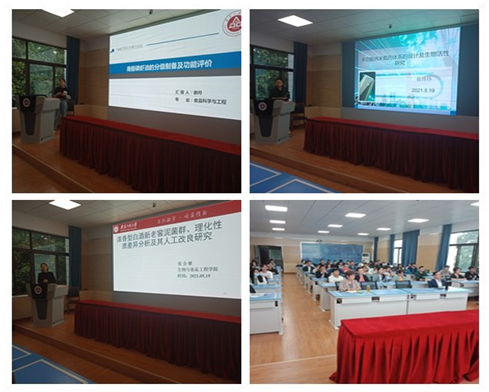 谢丹博士作了题为“南极磷虾油的分级制备及功能评价”报告,她分别从研究背景、不同溶剂提取对南极磷虾油品质的影响、南极磷虾油的分级制备、分级南极磷虾油的抗氧化能力评价、分级南极磷虾油的抗炎活性研究等五个方面作了汇报;张伟伟博士作了题为“多功能纳米载药体系的设计及生物活性研究”报告,他分别从研究背景、槲皮素低生物利用度多功能纳米载药体系的抗耐药性细菌研究、多功能纳米载药体系的抗肿瘤活性研究等方面与大家分享了自己的研究领域以及研究进展和取得成果;张会敏博士作了题为“浓香型白酒新老窖泥菌群、理化性质差异分析及其人工改良研究”报告,她详尽介绍了课题背景及文献综述情况,同时对新、老窖泥的菌群组成和理化性质差异、关键理化性质差异进行了分析;并对浓香型白酒窖泥的人工改良工艺研究进行了汇报交流。