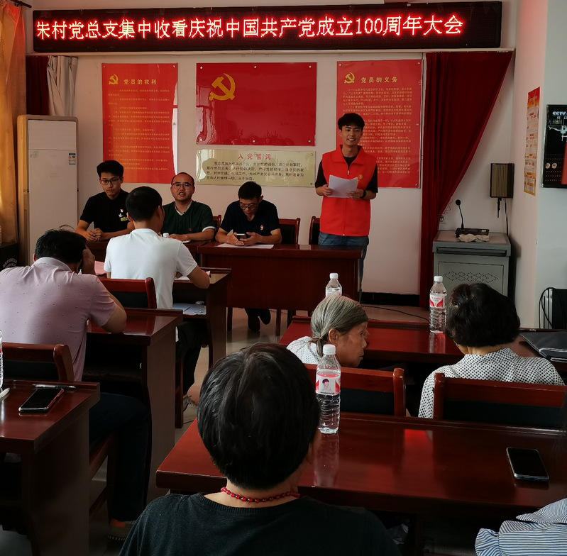 71日上午,小分队在朱村村党群中心二楼与全体党员共同观看庆祝党的100周年大会观看结束后由阮厚亮同学作为代表讲述老党员革命故事,回眸百年党史,讲好红色故事。最后由孙书记做总结发言,强调党员不忘初心,牢记使命,为共产主义奋斗终身。