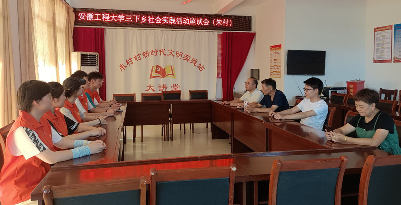 先后朱村村党支部书记孙永生、妇女主任王月季进行了简要沟通。下午1时,在书记的带领下前往朱村村党群服务中心与村两委,扶贫驻村工作队及乡村振兴驻村工作队工作人员进行深入交流,开展了“RayBetApp官网下载暑期社会实践活动座谈会”,党员干部与小队成员交流分享自己的基层工作经验。