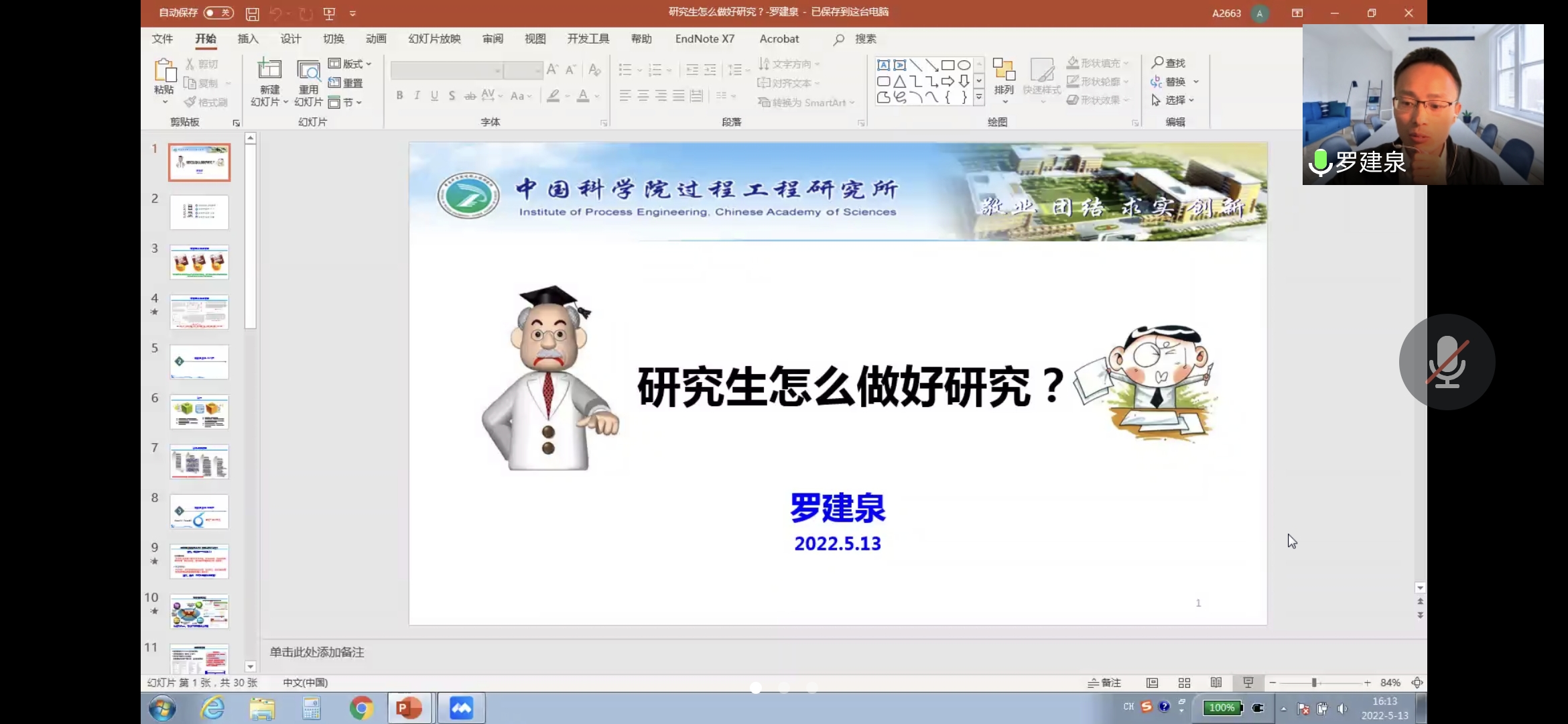 罗建泉教授的报告从研究生的初心和使命、研究生成长轨迹-入门篇、训练篇、突破篇四个方面讲述研究生怎么做好研究,其中主要介绍从搜集和查询文献、读文献、积累科研idea、计划实验、做实验到数据总结和作图、写论文、改论文和投稿整个科研流程及相关经验,最后简单讲述如何写好学位论文。