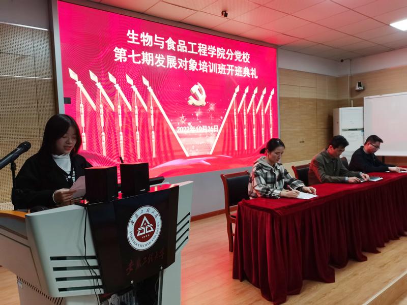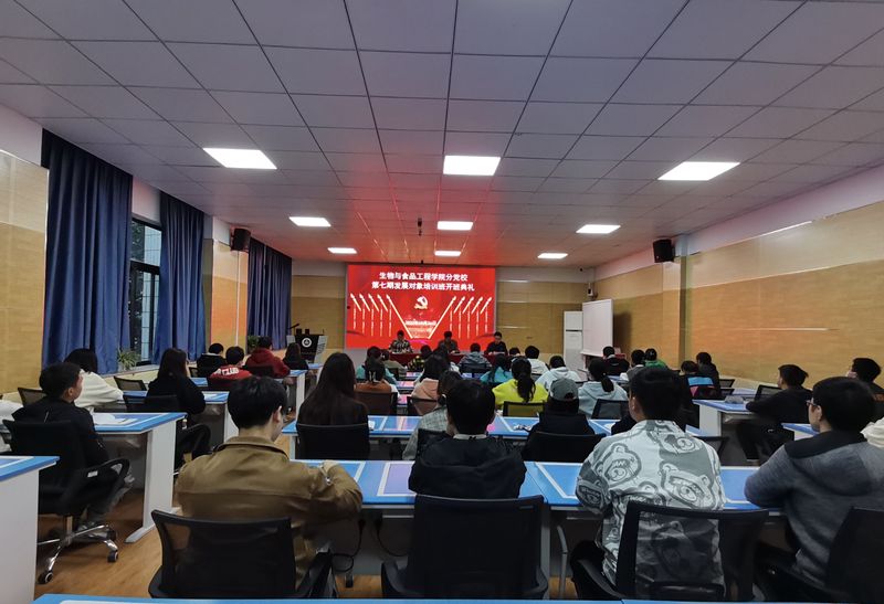 为提升“三全六专”育人实效,确保党员发展质量,10月26日下午,生物与食品工程学院第七期发展对象培训班开班仪式在学院虚拟仿真中心举行。院党委书记余传文、辅导员胡晓康、本科生以及研究生等44名学员参加开班仪式。仪式由培训班班主任钟莉娟主持。