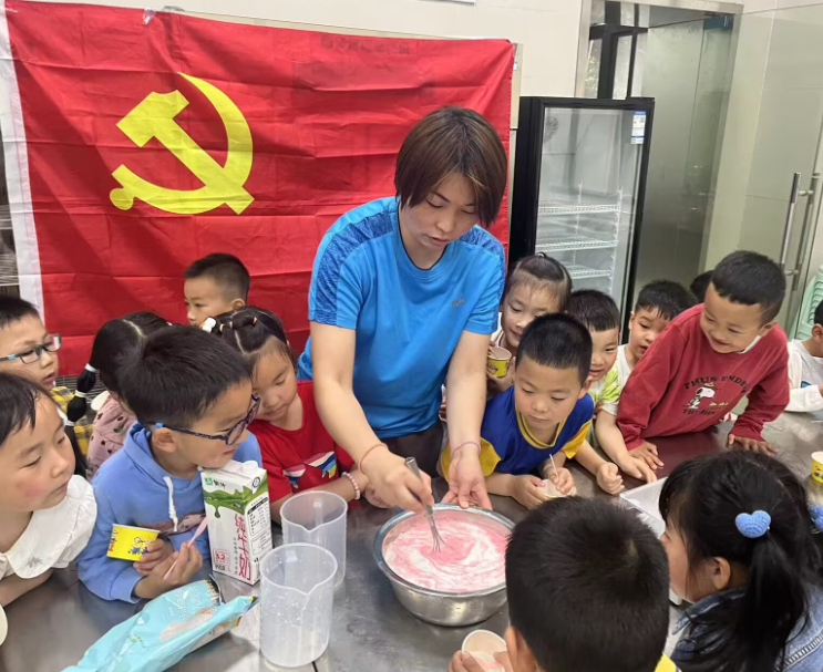 活动开始,研究生党支部学生党员充分发挥食品专业特长和动手实践能力,细心为幼儿园小朋友详细讲解了冰淇淋蛋筒的配料和制作工艺,并耐心指导小朋友们亲身参与体验冰激凌及蛋筒制作流程,随后共同品尝了亲手制作的“劳动成果”。
