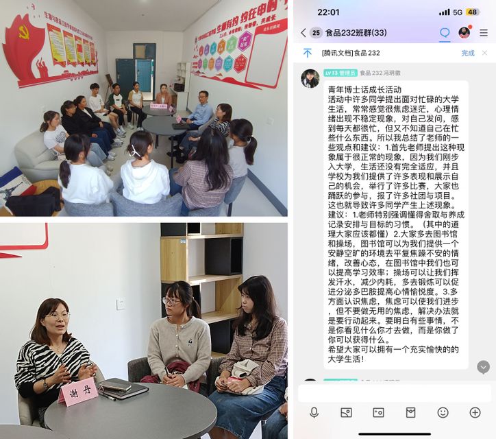 教育就意味着一棵树摇动另一棵树,一朵云推动另一朵云。活动结束后,食品232班冯玥徽同学第一时间将自己的收获和感受分享到班级群里,帮助更多的同学及时解决成长中遇到的困惑,轻装上阵迎接的挑战。