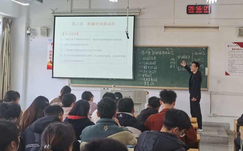 本次课程思政示范课由生物制药专业副教授钱森和老师讲授,课程内容为《药理学》第六章《胆碱受体激动药》。钱老师根据胆碱受体的分类,分别讲解了M受体和N受体激动药的代表性药物——乙酰胆碱、毛果芸香碱和烟碱,在讲解神经递质乙酰胆碱的发现时,融入了张锡钧院士的潜心科研,矢志报国的爱国情怀;在讲到毛果芸香碱缩瞳降低眼内压时,融入了“世界青光眼日”活动,倡议学生要做到守护眼部健康,才能共筑“睛”彩世界;将思政教育元素巧妙的融入到专业知识讲解过程中,做到了“润物无声”的教学育人目的。钱老师备课充分,讲课条理清晰,课中能够与学生积极互动,课堂气氛活跃,教学效果佳。