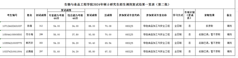 生物与食品工程学院2024年硕士研究生招生调剂复试结果一览表(第二批)