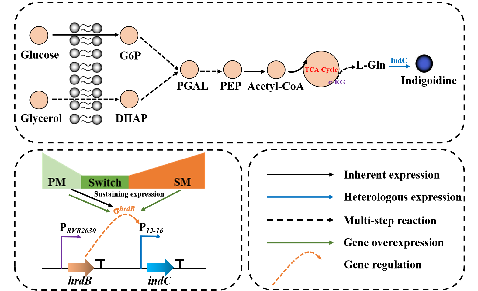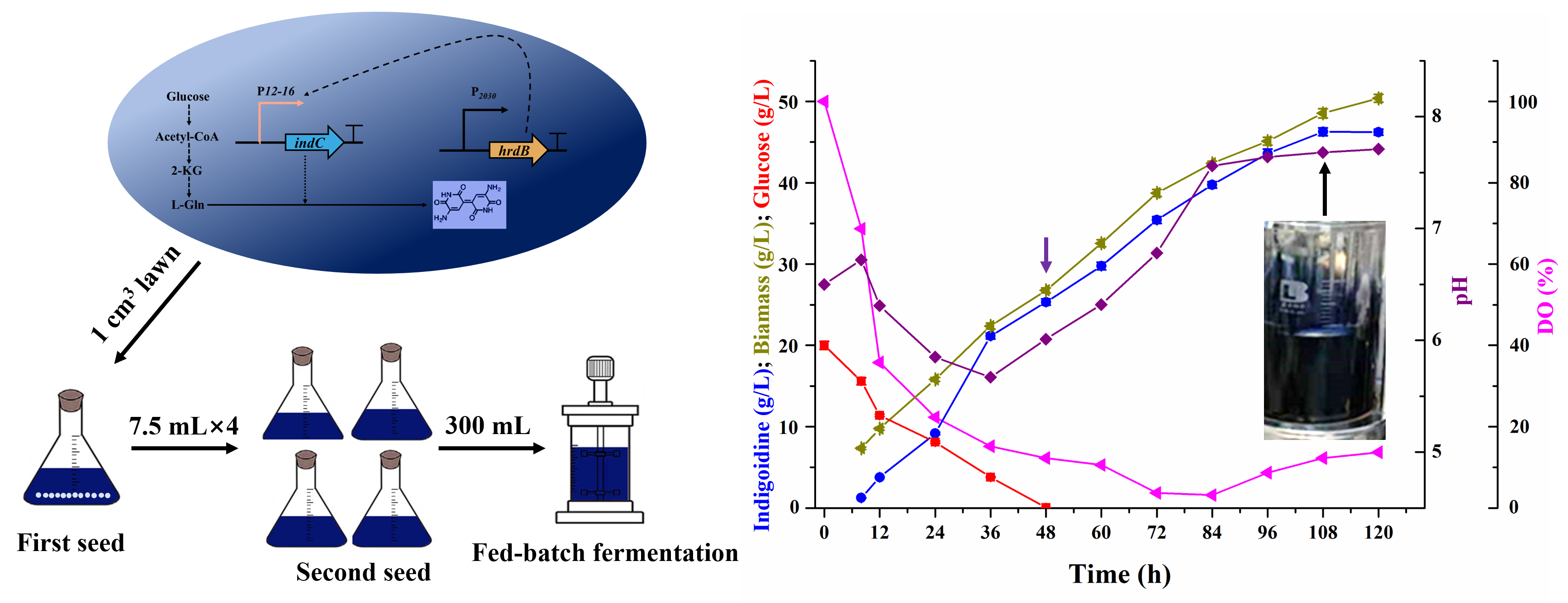 靛蓝是目前人类所知最古老的色素之一,也是应用于纺织印染行业最古老的染料之一。在历史的长河中,靛蓝的生产方式从古代的植物浸泡到近现代的化学合成,并逐步进入生物合成时期。靛蓝主要由L-谷氨酰胺经靛蓝合成酶缩合反应合成,靛蓝合成酶IndC大部分来源于链霉菌属。然而,链霉菌代谢开关在不同代谢阶段存在时空差异,因此全面优化其生产力是一个挑战,这使得链霉菌难以生产低附加值的大宗化学品。因此,大部分研究人员选择在异源宿主如大肠杆菌、谷氨酸棒杆菌等中过表达IndC,以实现靛蓝的高水平生产。