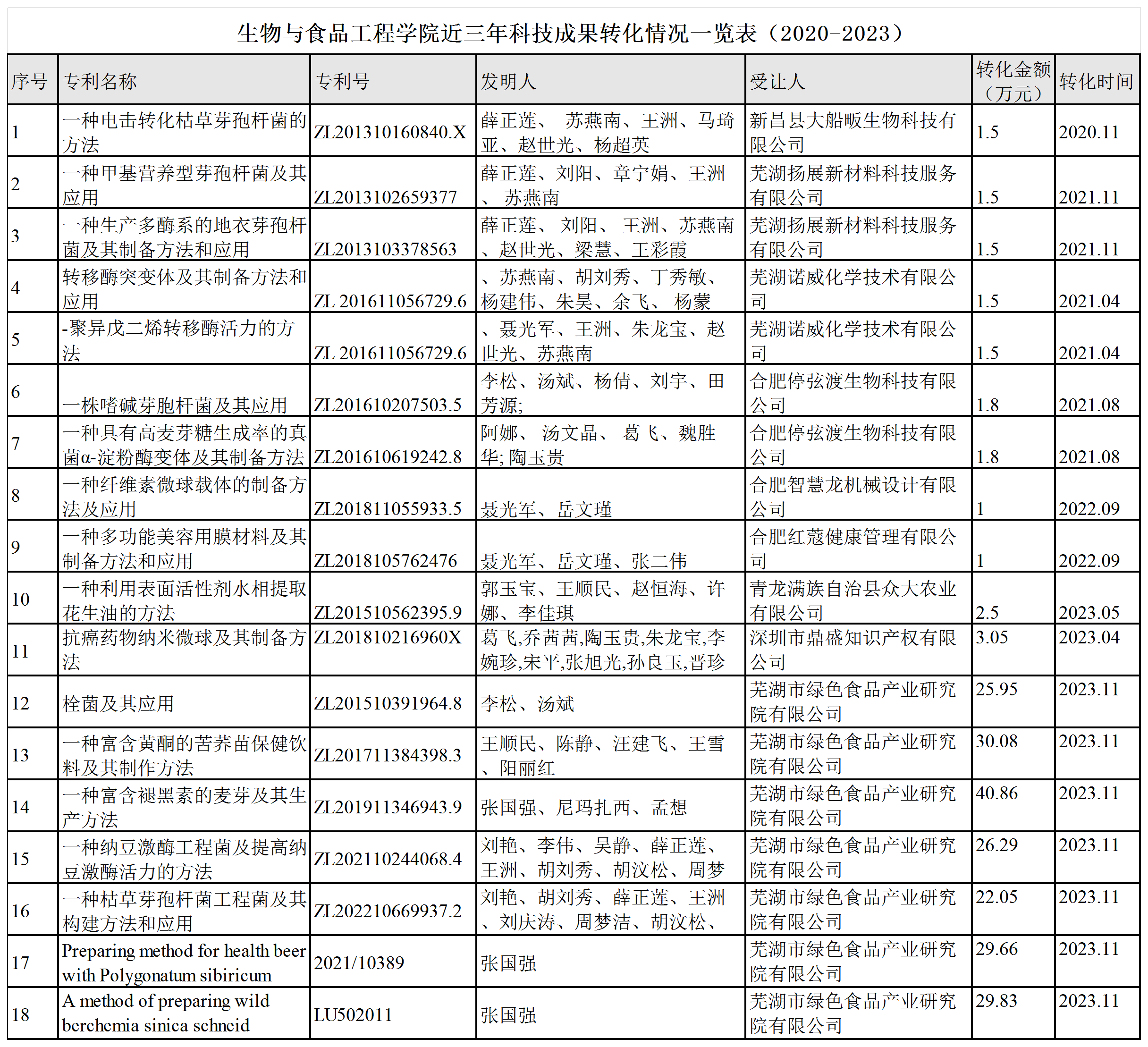 生物与食品工程学院科技成果转化情况一览表(2020-2023)