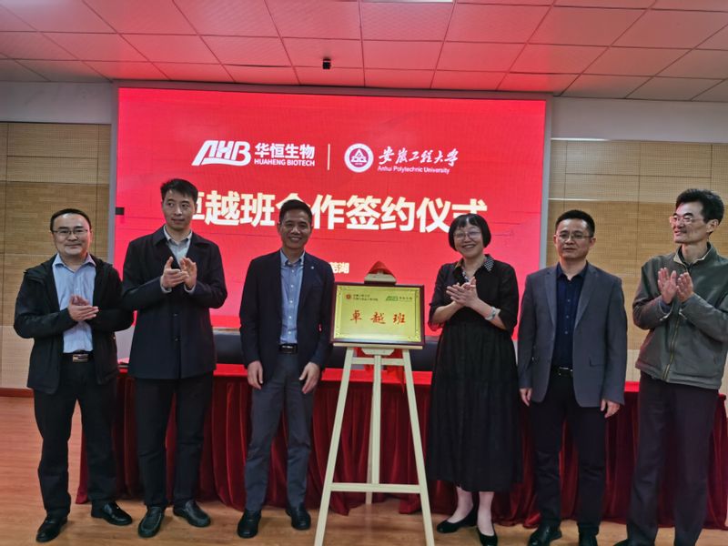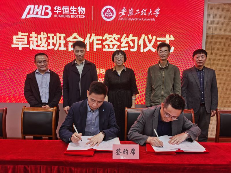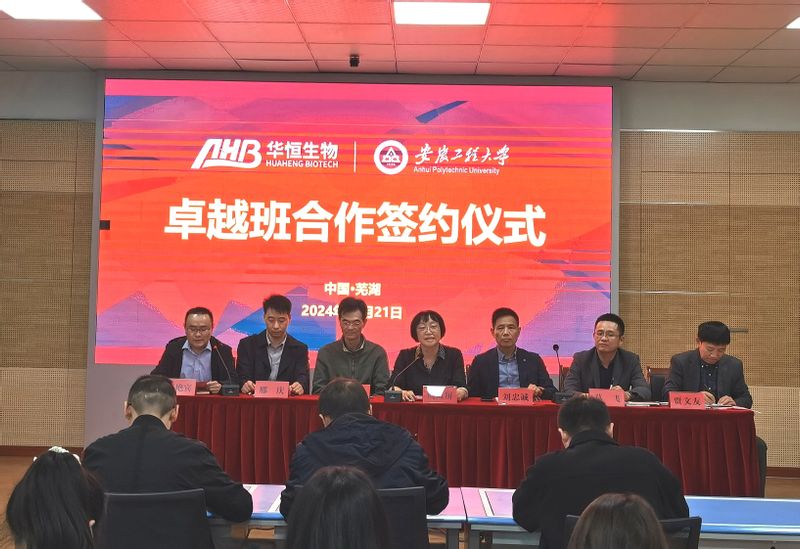 10月21日,学校与安徽华恒生物“卓越班”签约启动仪式在生物与食品工程学院虚拟仿真中心举行。安徽华恒生物科技股份有限公司副总裁刘忠诚,学校副校长周虹屏出席,教务处相关负责人,生物与食品工程学院党政领导、各专业负责人、专业教师代表、“卓越班”班主任、卓越班2022级、2023级学生代表参加活动。