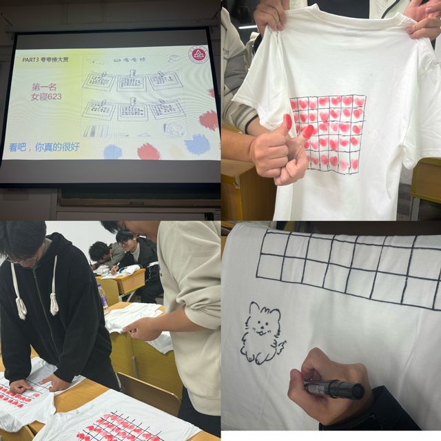 本次心理班会共含四部分。第一部分,思考与探讨,同学们依次对自己的优缺点进行分析,心理委员讲述正能量案例,引发同学们对于自我价值的思考;第二部分,短片播放,心理委员播放正能量短片,并总结短片寓意,引导同学们深刻认知、认可自己的价值,不断完善自身,成就更好的自我;第三部分,“夸夸榜”评比,心理委员公布班级第一次“夸夸榜”评比结果,女寝623荣获第一名,此环节旨在增强同学们对寝室的归宿感、认同感、责任感,提升寝室凝聚力;第四部分,“心灵涂鸦”,心理委员讲述完涂鸦要求后,同学们随即独自创作,每一幅作品的正面是同学们天马行空的个性化创作,背面则是全班同学的手印,手印呈心型,寓意着班级四十颗心紧密连接,团结一致。