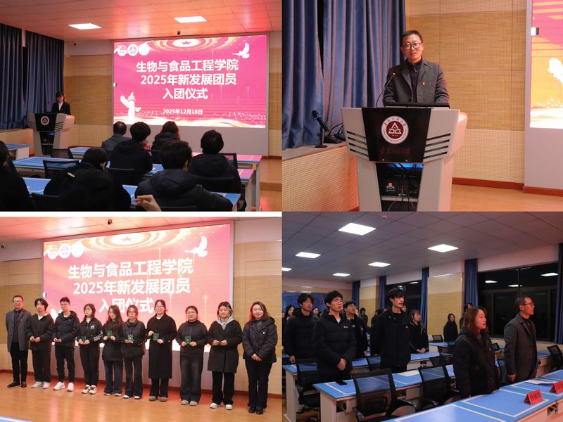 12月18日下午,生物与食品工程学院2025年新发展团员入团仪式在虚拟仿真中心顺利举行。学院党委副书记王彦青、团委书记何祥玲、优秀团员代表及44名新发展团员参与活动。仪式由学院团委副书记(学生)丁宣尹主持。