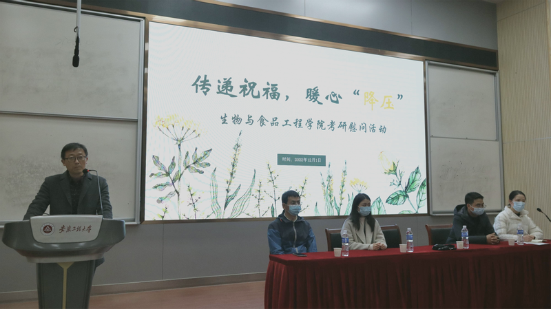 为推进学院“三全六专”工作落细落实,鼓励考研学子坚定信心、扎实学习,12月1日上午,生物与食品工程学院举办了“传递祝福 暖心‘降压’”考研慰问活动,学院党委副书记王彦青、学校心理健康咨询中心程香娟、团委负责人杨良军、毕业班辅导员李良渊及2019级全体考研备考生出席参加本次活动。活动由学院心理联络员钟莉娟主持。