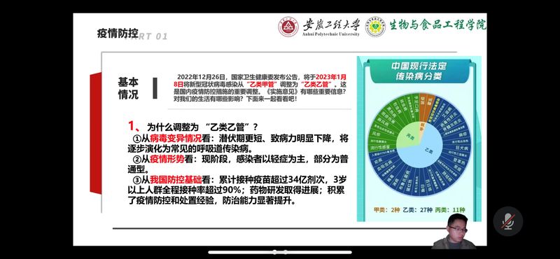 辅导员胡晓康老师解读了《关于对新型冠状病毒感染实施“乙类乙管”的总体方案》,引导学生树牢并自觉践行“健康第一”理念,坚持戴口罩、勤洗手等良好卫生习惯,保持宿舍卫生干净通风,加强身体锻炼,保持健康生活方式,提升健康素养和自我防护能力。