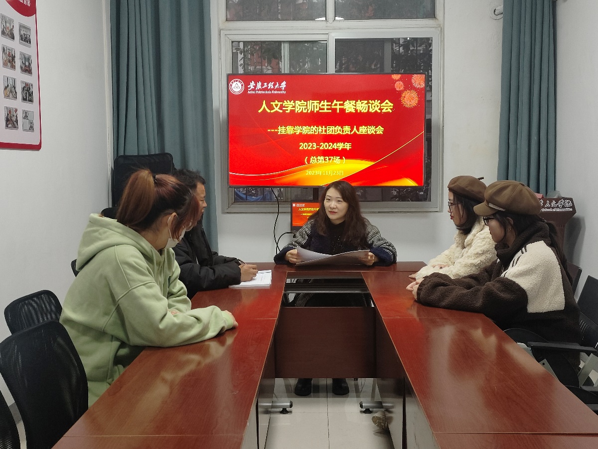 为深入贯彻落实习近平总书记关于青年工作的重要思想,推深做实“三全六专”育人实践,充分发挥学生社团育人功能,11月23日,人文学院在和谐社区工作站“师生午餐畅谈室”组织挂靠社团负责人召开座谈会。活动由学院团委副书记利昕云主持,挂靠社团全体负责人参加。