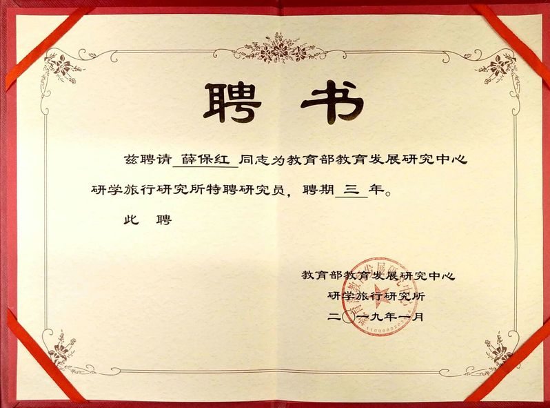 我校体验教育研究中心主任、体验产业学院执行院长薛保红与首都师范大学附属中学副校长刘明、四川省教育科学研究院院长刘涛、景德镇陶文旅集团董事长刘子力、江西省教育厅副厅长刘菊娇、上海市青少年校外活动营地-东方绿舟党总支书记杨昕、深圳市中小学德育基地校长杨春良、北京市海淀区教育科学研究院院长吴颖惠、济南市天桥区教育局局长张萍、《中国德育》杂志社主编张宁娟、教育部基础教育课程教材发展中心评价处处长张珊珊、北京师范大学教育学部教授郭华、人大附中北京经济技术开发区实验学校副校长韩东、原西安市教育局副调研员韩新、清华大学附属小学校长窦桂梅、宜昌市教育局党组副书记翟秀刚等16位同志被聘为教育部教育发展研究中心研学旅行研究所特聘研究员。