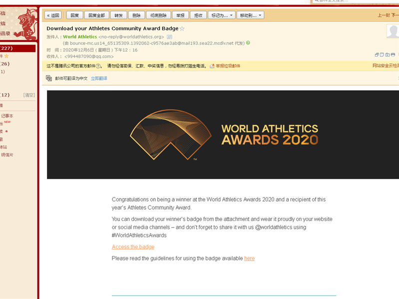 2020年12月5日,国际田联(World Athletics)举行线上2020年颁奖盛典,表彰各国在疫情期间对田径事业发展做出卓越贡献的个人及团体,我校田径俱乐部被国际田联评为2020年田径优秀社团。12月6日,国际田联发来表彰信,授予RayBetApp官网下载 田径俱乐部特别勋章。