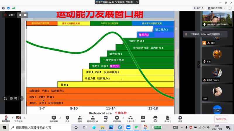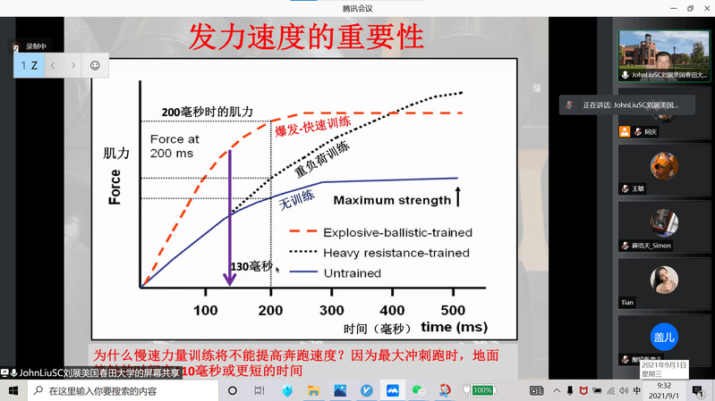 2021年9月1日,应我院邀请,美国春田学院体育健康系终身正教授和博士生导师,美国春田学院霍英东体育运动交流基金项目主任,东京奥运会中国赛艇队特邀体能教练刘展在线为我院作了题为《运动员爆发力训练的新思路与新方法》的学术报告。此为刘展教授为我院师生所作暑期第二场体能训练专题学术报告,报告会由副院长金庆红主持,学院100余名师生在线收看了报告。