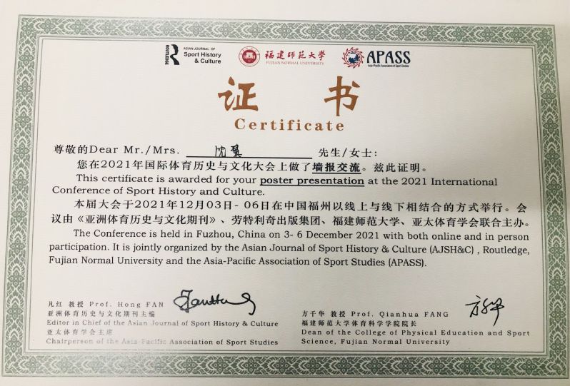 2021年12月3日-6日国际体育历史与文化学术大会在中国福州举行,大会主题为“亚洲体育比较分析中的关键议题”。会议由《亚洲体育历史与文化期刊》(AJSH&C)-劳特利奇、福建师范大学、亚太体育学会(APASS)联合主办。全国诸多优秀学者从多方面多角度阐述亚洲体育发展历史,探讨亚洲体育发展中的关键议题。