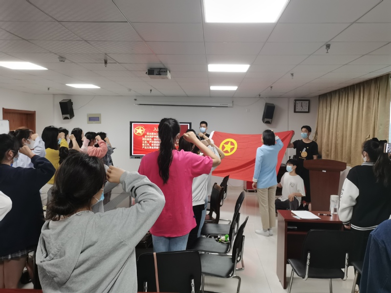 在鲜艳的团旗前,全体成员共同举起右拳庄严宣誓,青春的誓言激扬澎湃、充满干劲,激励着同学们团结一心,不断地奋发向前。