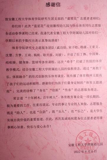 6月10日下午,体育学院研究生团支部的蓝星花志愿者服务团队在学校附属幼儿园顺利结束了本学期的志愿服务活动。