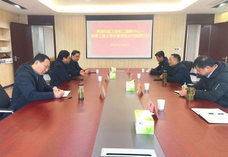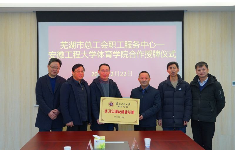 2月22日上午,在芜湖市总工会职工服务中心,体育学院与芜湖市总工会就人才培养基地、学生实习实训和就业基地建设举行了授牌仪式。芜湖市总工会党组书记、副主席王满平,市总工会党组成员、副主席张洪庆,职工服务中心主任段中华,体育学院党总支书记杨善祥,党总支副书记王辉,副院长金庆红,院团委负责人范同军参加了授牌仪式。授牌仪式由王满平主持。