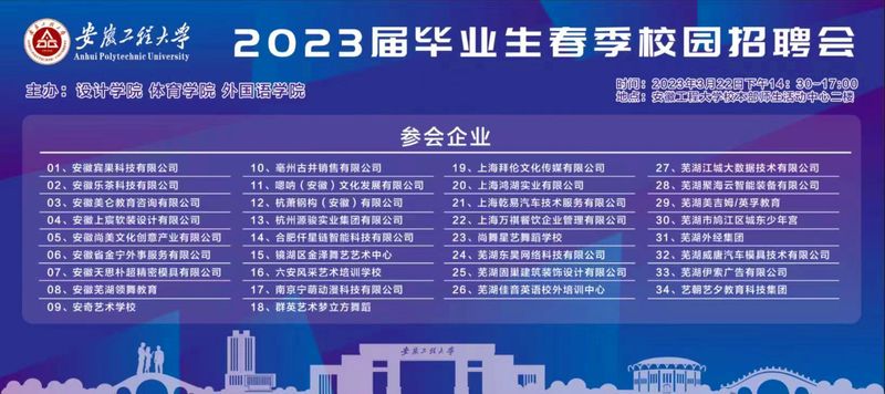 杭州源骏实业、上海拜伦文化传媒、南京宁萌动漫科技、安徽美仑教育、杭萧钢构(安徽)有限公司、芜湖城东少年宫、芜湖外经等30余家公司应邀参加招聘。企业单位涵盖上海、南京、杭州、安徽等长三角地区多个城市。招聘会现场,毕业生们就感兴趣的单位和岗位仔细询问相关信息,积极递上精心准备的个人简历,与用人单位进行充分交流。各企业代表从公司未来职业规划、行业前景、业务范畴、岗位职责、薪资福利和晋升空间等方面向前来咨询的同学们进行详细的介绍,双方沟通坦诚、气氛十分融洽。参加完招聘会的体育表演191班的李登伸表示,很高兴能在校园里参加属于我们自己的大型专场招聘,感谢学校为我们提供了与企业面对面交流的机会。参会企业对本次招聘会的组织和服务表示非常满意,对三个学院毕业生的综合素质表示认可。