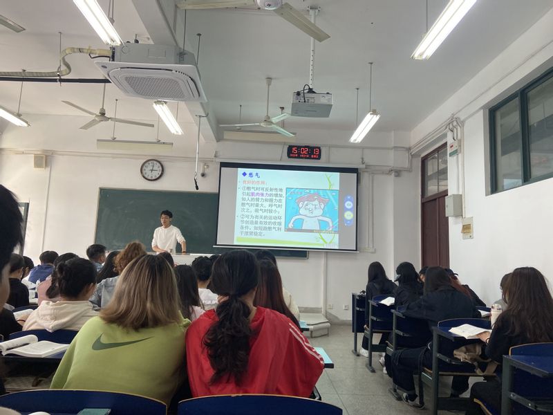 闫老师以复习前一章节自然过渡,通过生动地讲述和富有趣味的ppt图片,将呼吸与运动的关系阐述的清晰易懂,把健康体育、终身锻炼有机嵌入到教学内容中,在运动中掌握正确的呼吸方法,养成良好的锻炼习惯,从而达到健康常伴。闫老师轻松驾驭课堂、熟练管理课堂,在讲授专业知识的同时有机融入课程思政,气氛轻松热烈,学生兴趣盎然,从亲身体验中认识呼吸对运动产生的影响。