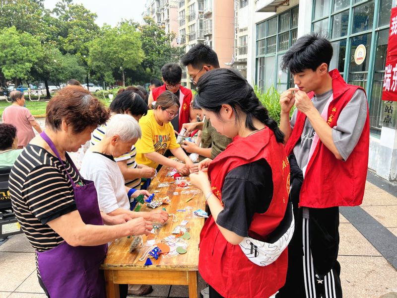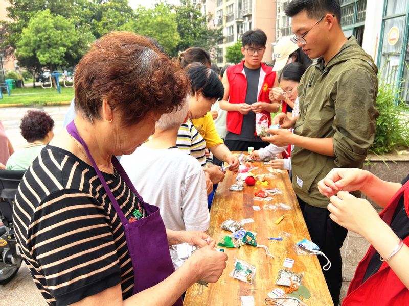 随后,学生党员及志愿者同学向社区群众展示了此次活动分发的粽子挂件,并给每名来到现场的群众分发了手工材料包和各类中草药原材料,现场进行了教学指导。爷爷奶奶们收到或完成自己动手制作的香囊脸上洋溢着开心的笑容。