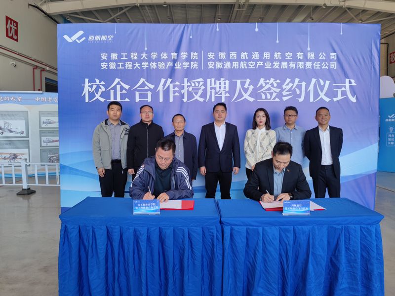 为主动融入芜湖地方经济发展,助力航空特色优势产业,体育学院主动对接在芜航空产业企业,推动航空体育、航空研学、航空营地等新兴体验产业形成产业链,更好促进以“文教体旅康空乡”为特色的产业融合发展,形成校企长效合作机制,推动湾沚区全域体验产业跨越式发展。11月7日上午,体育学院与西航航空共建航空营地产业研究院、实践基地和航空人才培养基地签约揭牌仪式在西航芜湖湾沚基地举行。