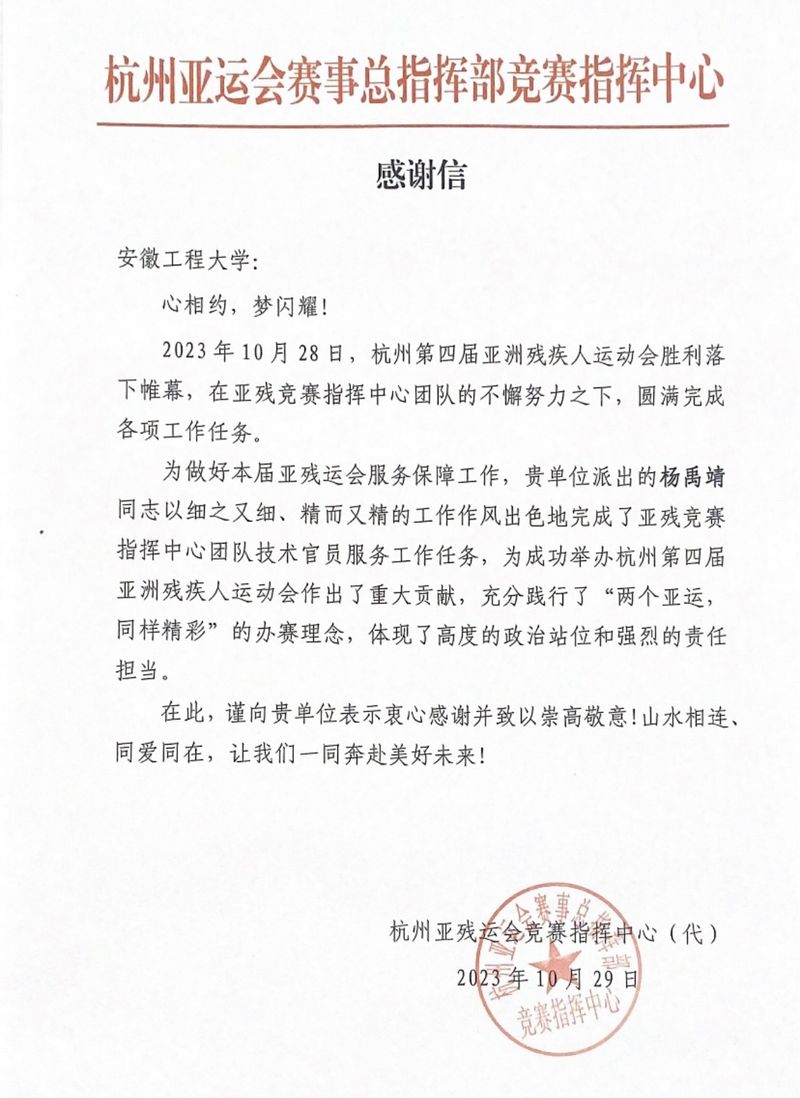 杭州第19届亚组委、第4届亚残组委致信感谢我校研究生杨禹靖同学