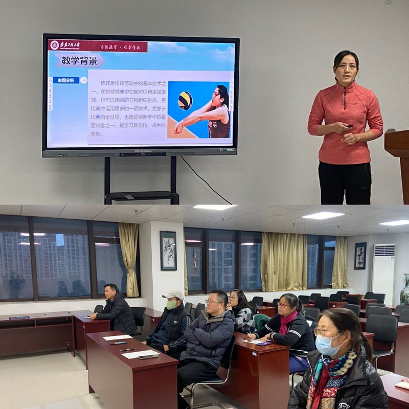 薛保红团队的《拓展训练》课申报了第三批国家级一流本科线下课程。薛保红老师通过以身示范、以文化人,在内容和教学方式方法上更加与时俱进,突出课程对学生综合素质的培养,并以卡巴迪项目和亚运会发展史为切入点,把“四史”教育元素充分融入课堂教学,思路新颖,素材丰富,具有很强的吸引力和感召力。全体人员就课程PPT的制作、思政元素契合度、评价标准的吻合度、数据来源的准确度和解决方法进行了深入交流与研讨。孙霞老师的《排球基础》课,从热身准备、动作要领等方面精心准备,并辅以高质量示范,让受众能够较快理解动作要领,掌握专项技能。两位老师课程展示后,参会人员从PPT的制作、教学素材遴选、教学环节优化等方面提出了中肯的意见和建议。