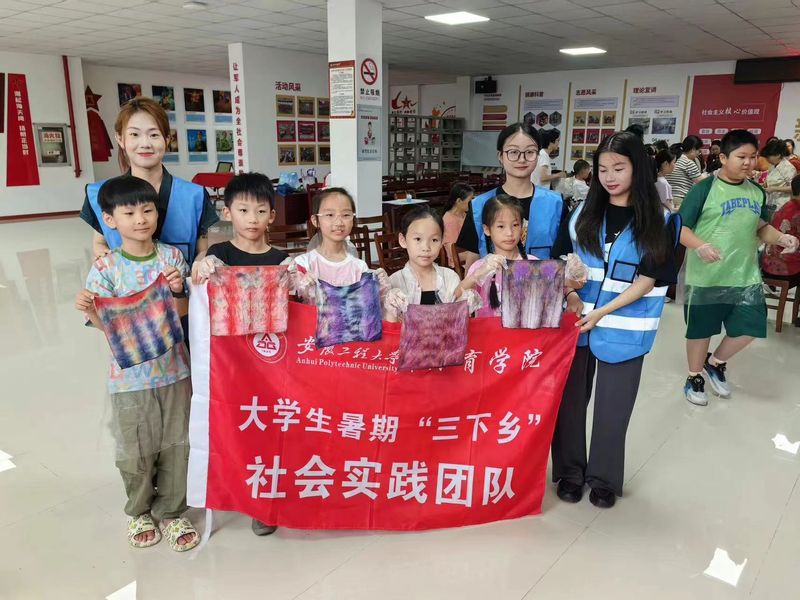 7月12日上午,队员们来到鸠江区官陡街道神东社区,参与了面向社区居民开展的社区扎染服务活动。同学们分发提前浸湿的方巾,配备好工具,逐步讲解扎染步骤。活动过程中,团队成员帮助孩子们绑皮筋、拧瓶盖、吸染料,协助孩子们完成许多有创意的扎染小作品。在社区志愿服务中,同学们承担起了一份社会责任,学会了关心他人,提高了沟通能力,为丰富社区生活贡献了自己的力量。