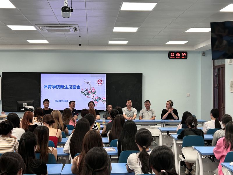 9月9日上午,体育学院在6教301举行2024级本科生新生见面会,学院党总支书记杨善祥,副书记、院长胡好,副书记马晓琼,副院长金庆红、谢叶寿,团委书记范同军、辅导员黄蓉静和2024级全体本科生参加了会议。