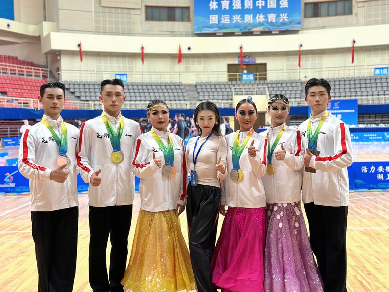 芜湖市体育舞蹈代表队经过层层选拔,组成25人参赛队伍。体育学院教师陶惠慧受邀担任此次芜湖市体育舞蹈代表队领队,另有6名学生入选芜湖市代表队队员。在本次比赛中,芜湖市队有20名运动员荣获2枚金牌、4枚银牌、3枚铜牌以及多个前8名的好成绩。体育学院王西尧、蒋婧、王腾达、尹凯文、宗珩、翟久依等同学在十项全能、八项全能和B组拉丁舞三个组别中共荣获2金2银2铜的优异成绩,王西尧和蒋婧还获得“体育道德风尚运动员”。能够代表芜湖市在高水平比赛中获得优异成绩,不仅展示了体育学院学生扎实的专业素养和良好的精神风貌,也充分展示了学校“三全六专”实践育人的成效,更是为芜湖市体育舞蹈爱好者争得了荣誉。