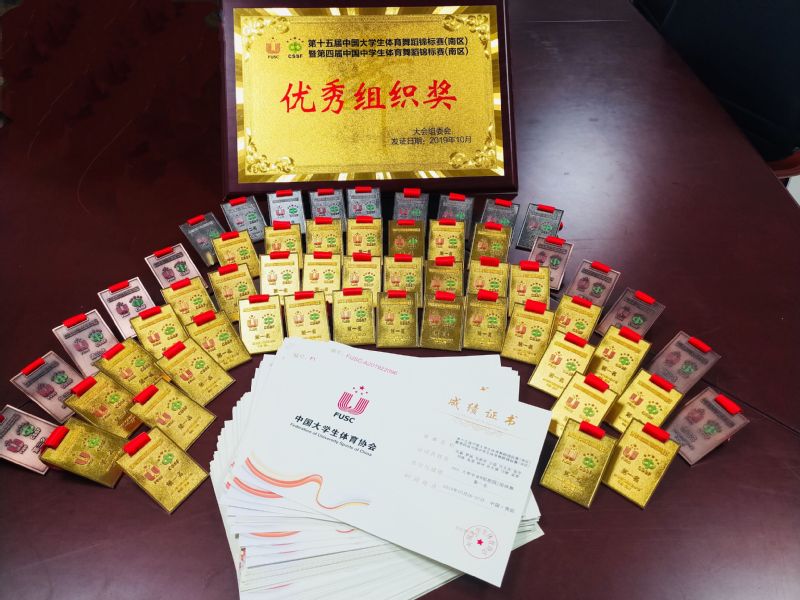 我校体育学院15名学生组成的体育舞蹈代表队在教练叶子老师和许诚老师的带领下,参加了大学专业B组的单人及集体项目,经过两天的激烈角逐,我校学子力克群雄,共获得冠军5项、亚军5项,季军4项,第四名3项,第五名1项,第六名1项,第八名2项的好成绩。其中谷胜乔、徐珂两位同学荣获大学专业院校B组单项C第一名、单项P第二名和大学专业院校B组五项L第四名;张宇、张笛两位同学荣获大学专业院校B组单项Q第二名和“优秀运动员”称号,团体赛中也是一鸣惊人,荣获四个第一名!我校学生凭借扎实的专业技术和严格的纪律赢得了荣誉,也赢得了对手的尊重和组委会的高度认可,荣获优秀组织奖