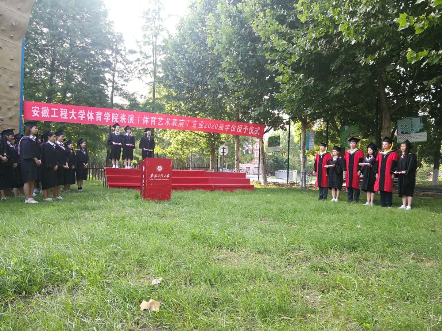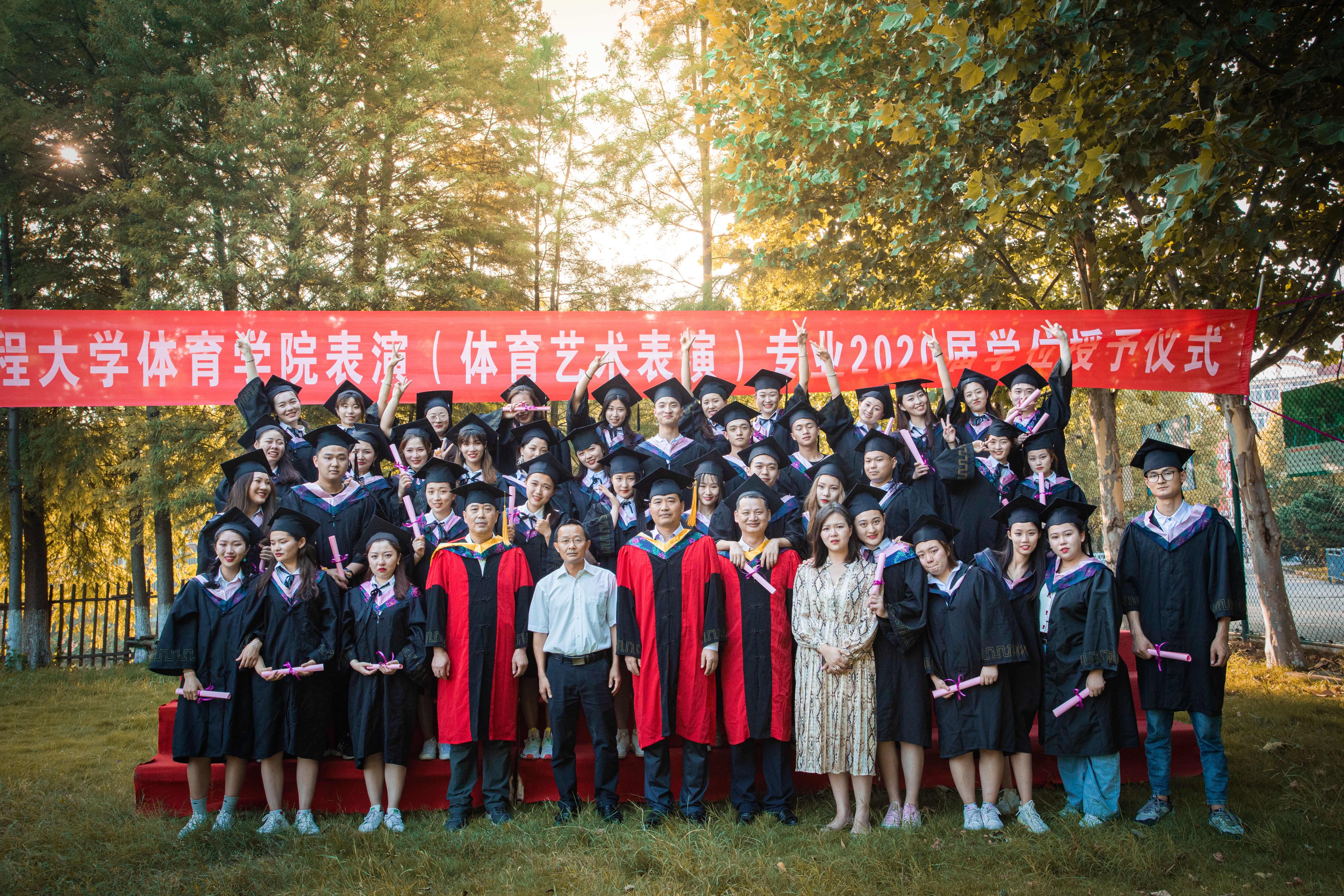 2020年6月8日下午,体育学院在香樟营地举行了2020届本科生学位授予仪式。体育学院党政领导杨善祥书记、胡好院长、胡万祥院长及部分老师,以及体育学院2020届部分毕业生来到了现场。 体育学院的毕业典礼一直是学院特色活动,受本次疫情影响无法像往年在师生活动召开,但是学院为了不给毕业生留有遗憾,在保证安全的前提下,在户外举办了一场小型简单却意义深远的仪式。