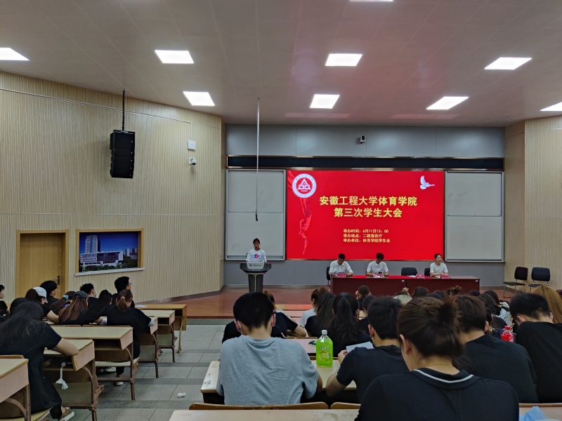 6月11日下午,体育学院第三次学生大会在2J报告厅顺利召开,学院团委书记孙霞,校学生会主席江周等相关人员出席会议,体育学院193名学生参加会议。会议由体育学院学生会执行主席张文飞主持。 会议在昂扬的国歌声中开幕。孙霞代表学院团委向大会的顺利召开表示祝贺,向筹备此次大会的各部门工作人员表示感谢,同时也向与会人员表达了美好的祝愿,她希望同学们能够以饱满的精神状态和认真负责的工作态度,在充分发挥民主,切实履行职责的基础上,圆满完成大会的各项既定任务。校学生会主席江周对我院学生会工作给予了高度的肯定,他希望新一届学生委员会能够继续坚定理想信念,发扬优良传统,落实科学管理,引导全院学生,实现全面发展。