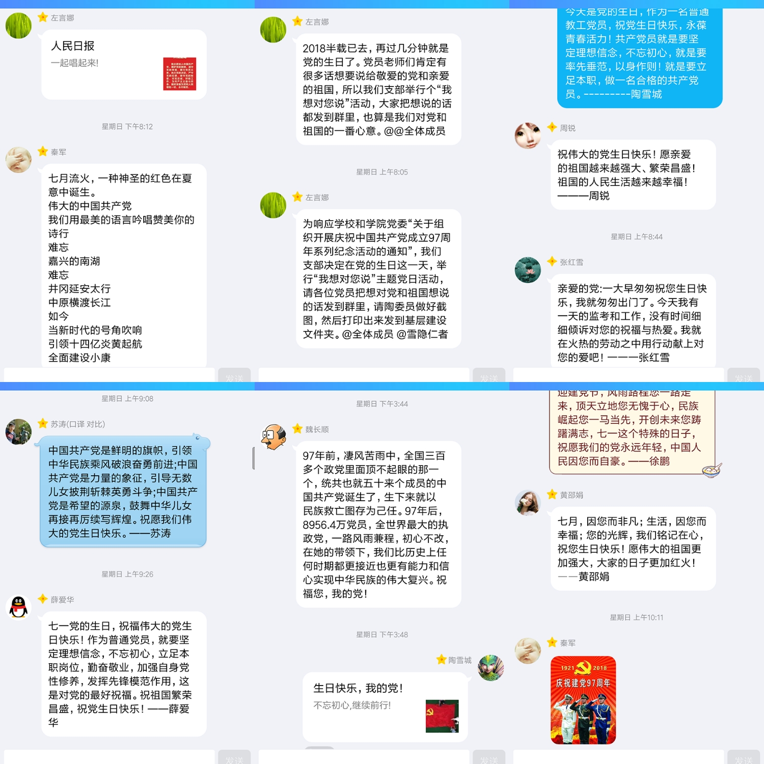 支部党员们纷纷在党建群里发表了对党的生日祝福,红色中国共产党,有革命的不屈与顽强,有改革的创新与进取,有一心为民的担当与务实,祝福伟大的党,不忘初心,砥砺前行!党员们表示要坚定跟党走,拥护党的领导,追随党的脚步,砥砺前行,认真践行合格党员标准,始终保持立德树人、干事创业、崇学善学、开拓进取的精气神,时刻铭记党员身份,积极为党工作,为学校教育事业工作,争当时代先锋。