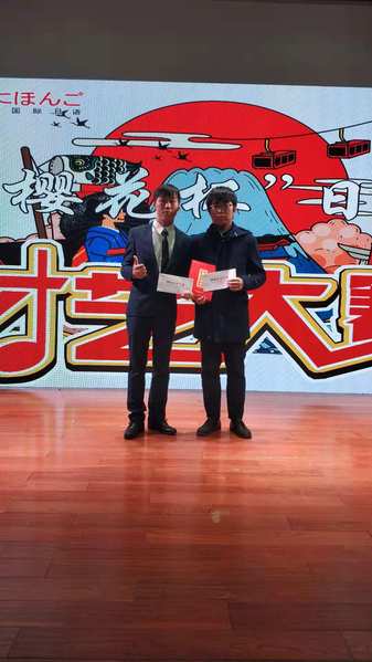 11月17日下午,我系日语专业2017级周续、王旭同学喜获“安徽省第一届樱花杯日语才艺大赛”决赛三等奖,指导教师李晓光。本次大赛是由安徽省日语教学委员会主办,三联学院与樱花国际日语联合承办,旨为提高日语专业大学生综合能力,支持学生发展自己兴趣爱好而创设的。我系学子表演的节目是《花火》,属日本传统曲艺—“漫才”,他们发音清晰,表演滑稽,风趣幽默的捧斗哏,引得台下观众开怀大笑,内容完整流畅最终荣获三等奖。