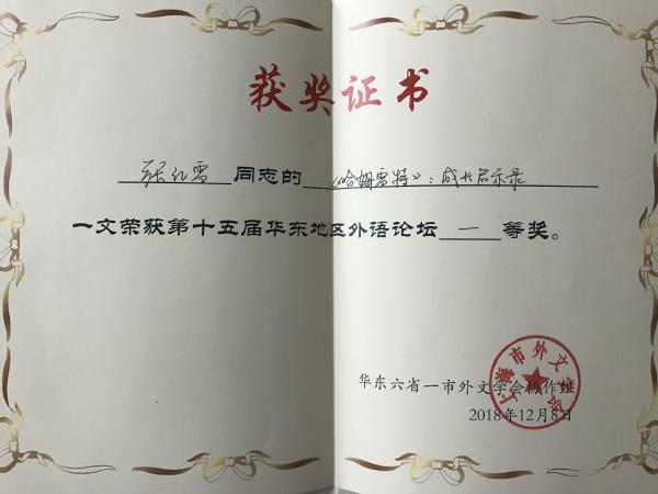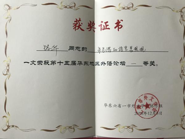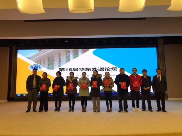 本次论坛同时推出了《华东外语论坛第13辑》,由上海外语教育出版社根据各省外文学会推荐、协作组遴选出优秀论文,汇编成论文集出版。本次大会共收到论文115篇,收录48篇。我校教师路华的论文《朱光潜的语言思想观》和张红雪的论文《<哈姆雷特>:成长启示录》成功入选,并在优秀论文评比中双双获得一等奖。在12月8日上午的颁奖仪式上,路华作为安徽省获奖老师代表上台领奖,接受荣誉。我校外国语学院的教师连续多年积极参与论坛论文的投稿,并多次入选和获奖,展现了我院教师的学术水平和学术热情。