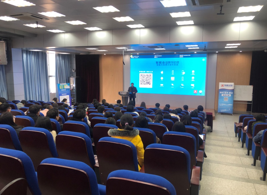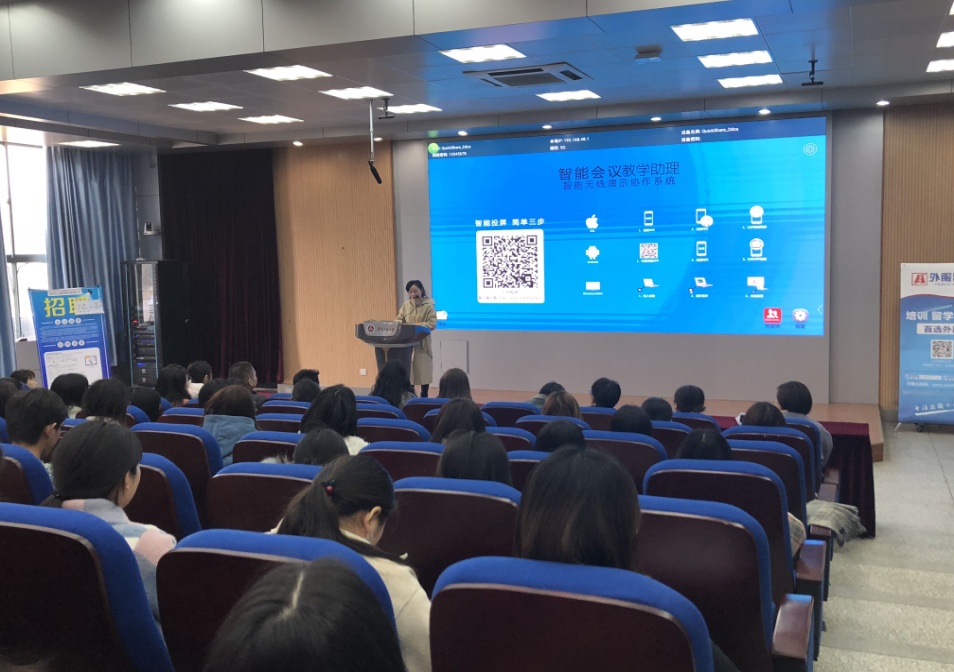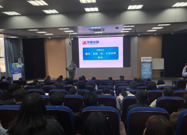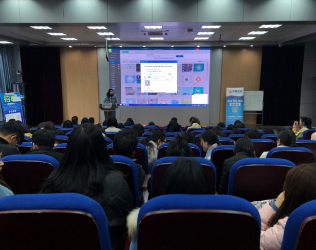 我院2005级毕业生周婷婷作为“海派乐青少儿英语”公司的代表首先向毕业生做了招聘宣讲。她逐一介绍了公司核心价值观、教学步骤、教学对象以及本次招聘岗位的具体要求等,通过与现场毕业生的互动为本场招聘会开了一个好头。接着,安徽智达冈山信息科技有限公司进行宣讲,作为一家日企公司,招聘代表向学生分享了独特的日企文化。中日双语结合的宣讲生动活泼,充分调动了学生的热情。随后芜湖外服语培中心、安徽新国壹教育咨询有限公司、芜湖中瑞集团股份有限公司依次做了招聘宣讲。
