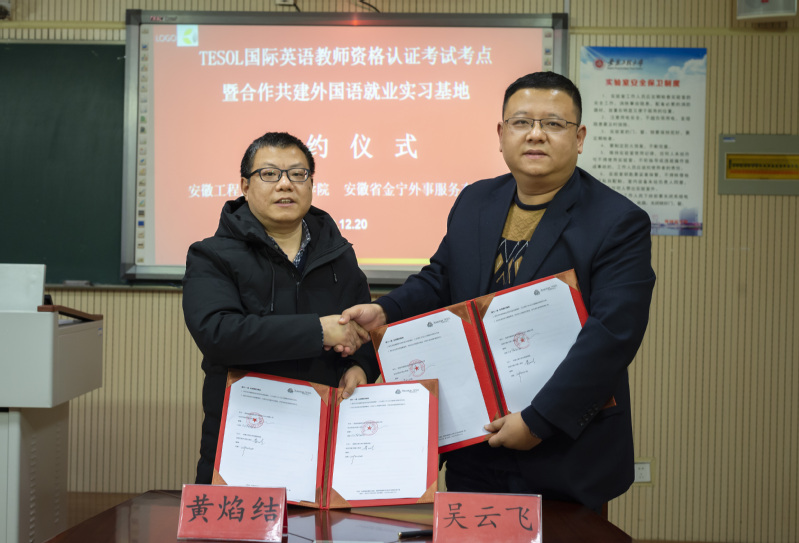 12月20日,TESOL国际英语教师资格认证考点揭牌仪式在外国语学院举行。安徽省金宁外事服务有限公司正式签约成为外国语学院合作共建就业实习基地。学院党委书记朱尚玉、院长黄焰结、副院长唐雪梅、安徽省金宁外事服务有限公司总经理吴云飞、芜湖市翻译协会会长刘进、副会长张荣等参加了揭牌和签约仪式。
