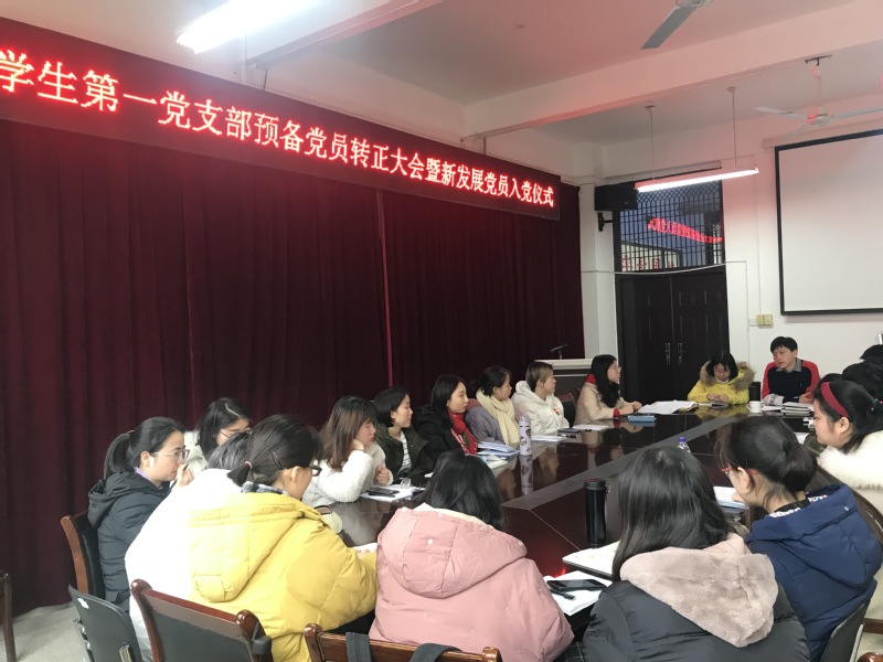 20191225日,外国语学院学生第一党支部举行预备党员转正大会暨新发展党员入党仪式。会议由支部书记张君主持。