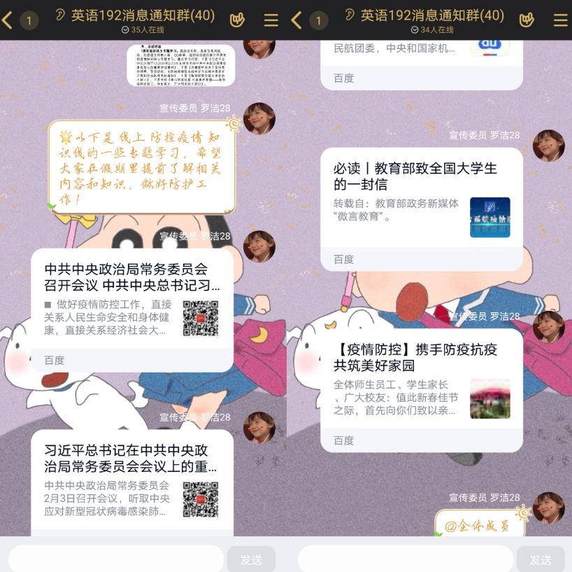 科学防疫,团员青年积极学习疫情防控知识。英语192团支部组织团员青年重点学习了习近平总书记在1月25日和2月3日主持召开的中共中央政治局常务委员会会议上的重要讲话精神。英语163团支部的团员青年细心地将学习心得整理成电子笔记。 英语162团支部采用漫画的形式对“新冠”病毒及其防控知识进行了科普。英语183团支部组织了一场“线上疫情防控知识竞赛”。传播权威信息、宣传防控知识、辨别疫情谣言,外院团员青年当仁不让,让团旗高高飘扬。
